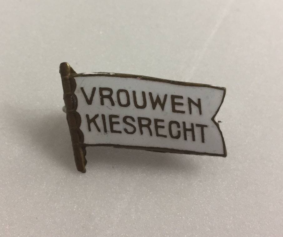 Speld in de vorm van een golvende vlag aan een korte stok met wit email rond de tekst.- Trefwoorden