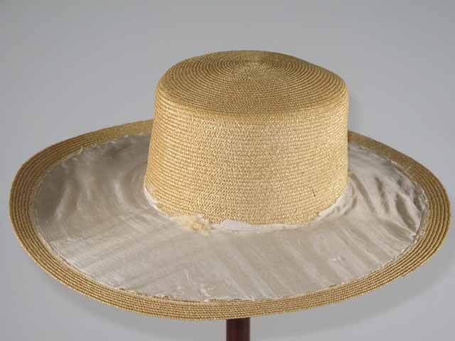 Hoed van naturelkleurige stro en cremekleurige zijde op de rand. Waarschijnlijk is de hoed niet af en ontbreekt de garnering, gezien de slordige afwerking.