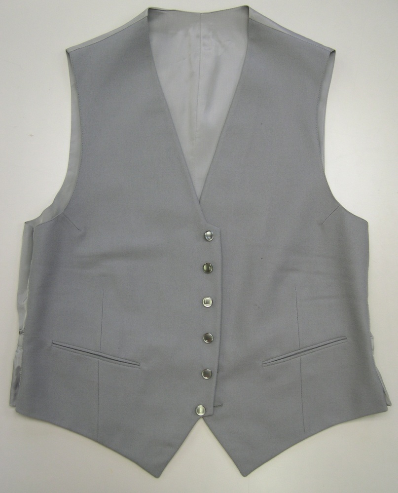 Grijs flannel vest sluit middenvoor d.m.v. 6 parelmoerkleurige grijze knopen. Rugpand grijze tafzijde, op taillehoogte in het rugpand een tunneltje met ingetrokken elastiek.