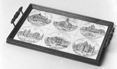 Rechthoekig dienblad met twee handgrepen. Het blad bestaat uit één grote tegel onder verdeeld in zes vakken met afbeeldingen van rijtuigen, koetsen en paardetrams