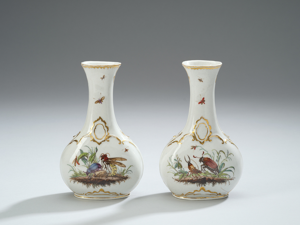 Stel ovaalvormige bloemflessen met polychroom decor van insecten. De flessen met in goud gehoogde rocaillereliefs op de zij- en voorkant. De voorzijde beschilderd met grote insecten te midden van graspollen, de achterzijde met een vlinder en kleine insecten. Merk: M:OL (onderglazuur blauw)