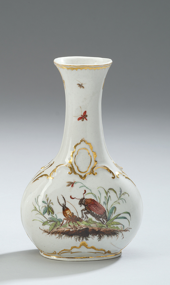 Wit porseleinen flesje, ovaal van vorm, met iets verwijdende lange hals. Versierd met enkele rococo-ornamenten in laag reliëf. Het lichaam is beschilderd met twee (fantasie)kevers, op een grondje in naturalistische kleuren. Aan de achterzijde een eenvoudiger decoratie van insecten. De randen en reliëfornamenten zijn met goud verhoogd. Ovaalvormige bloemfles met polychroom decor van insecten. De fles met in goud gehoogde rocaillereliefs op de zij- en voorkant. De voorzijde beschilderd met een meikever en een oorwurm te midden van graspollen, de achterzijde met een vlinder en kleine insecten. Merk: M:OL (onderglazuur blauw)