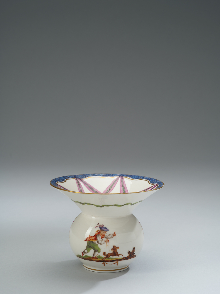 Veelkleurig beschilderde kwispedoor. Op de buik een met een hond spelende jongen en guirlande met in het midden een roze strik. De binnenkant vertoont blauw servetwerk en groen-roze draperieen. Merk: M: OL (blauw onder glazuur)