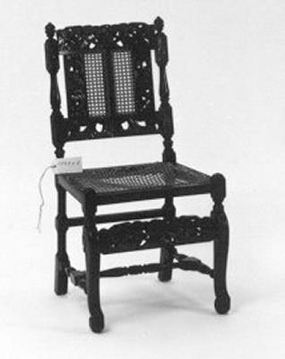 stoel met rotan zitting en rug en gebogen klauwpoten aan de voorzijde; houtsnijwerk met 2 cupido's die een kroon vasthouden- Trefwoorden