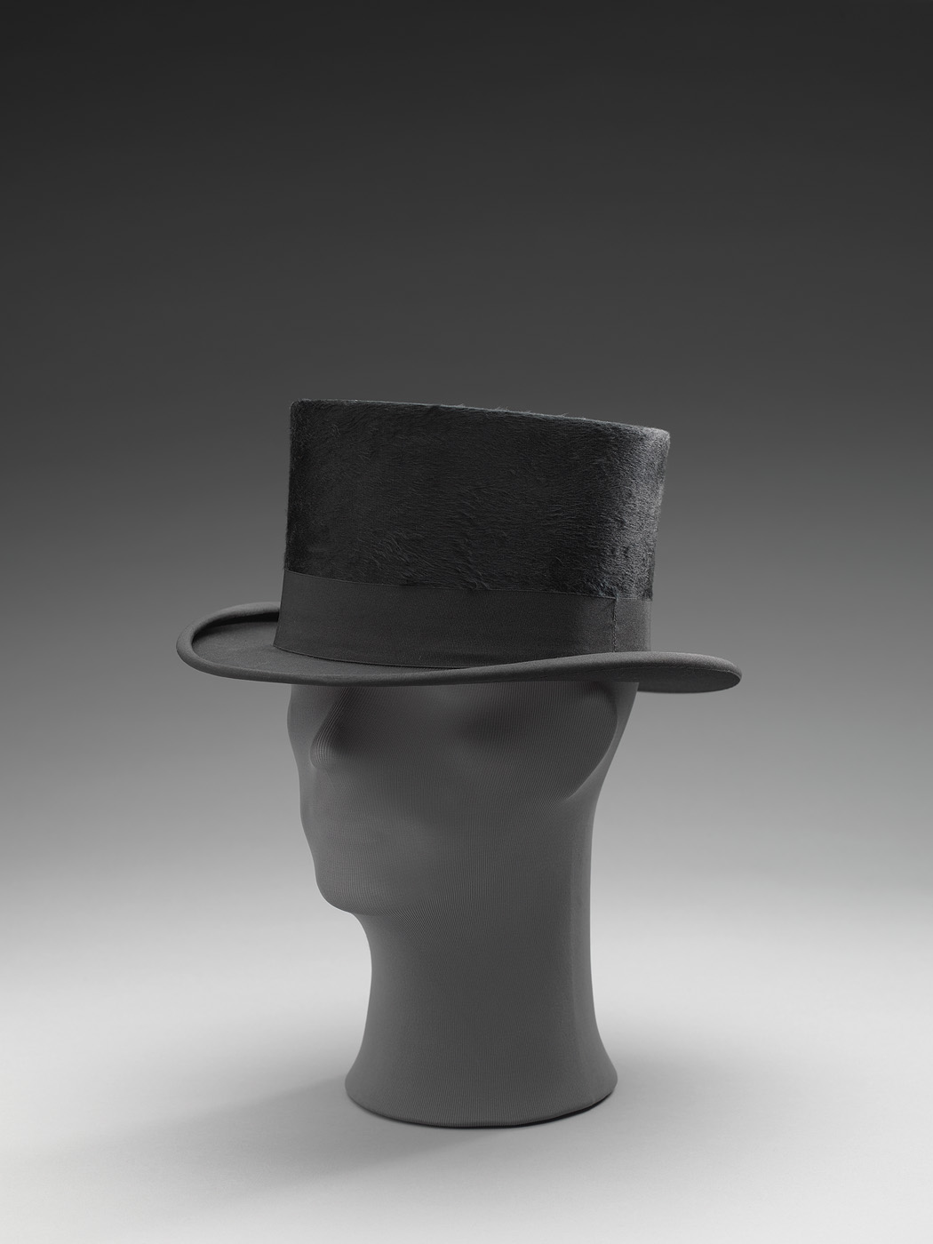 Hoge hoed van zwart vilt met een band van zwarte ripszijde. Voering van witte zijde met wit leren band langs de rand van de binnenkant. Aan de binnenkant van de bol is in goud de tekst "Tower House of England" gedrukt. Bewaard in speciaal gemaakte zwarte kartonnen doos, waarvan het bruine leren hengsel kapot is.
