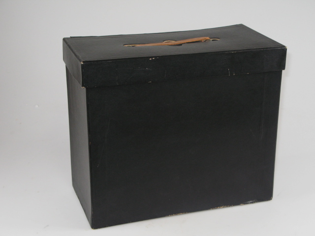 Speciaal gemaakte zwarte kartonnen doos, waarvan het bruine leren hengsel kapot is.