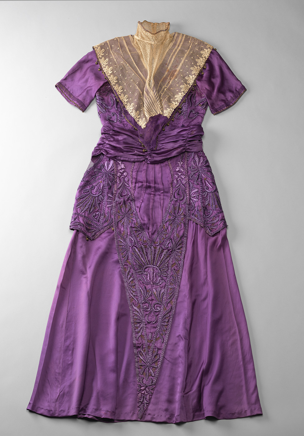 Bij de rok een geborduurde draperie, die bij schenking aan de rok zat vastgenaaid (nu los). Om het middel een gedrapeerde paars zijden ceintuur.