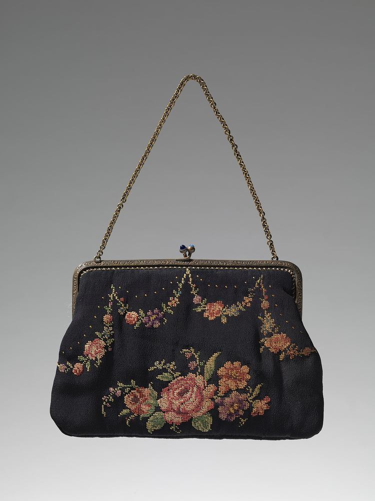 Zwarte rechthoekige beugeltas, op de voorkant geborduurd met bloemmotief en guirlandes, en zwarte effen achterkant. Kort metalen hengsel. De voering is van cremekleurige zijde.- Trefwoorden