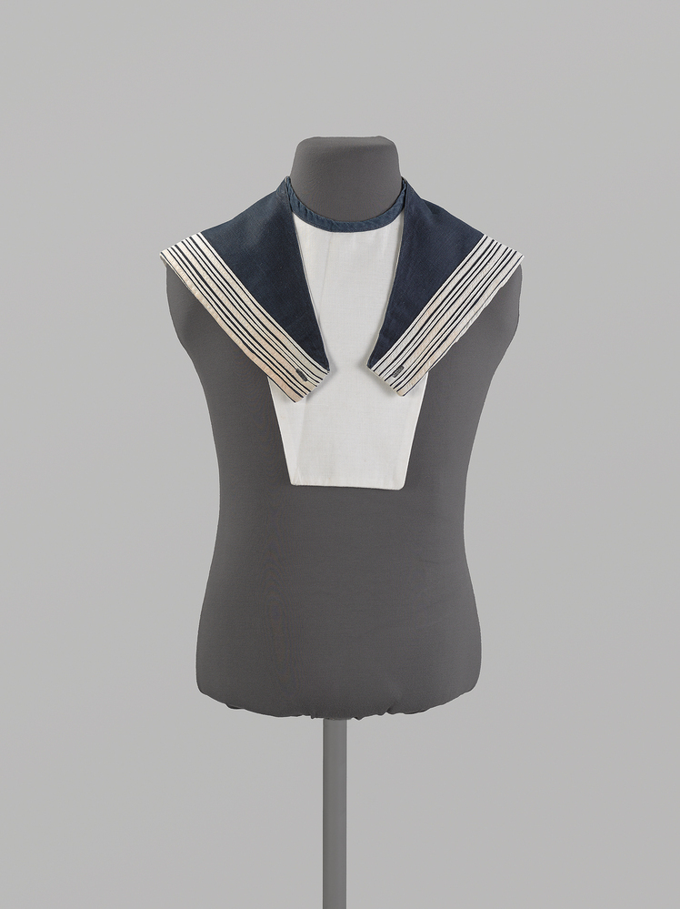 Witte bef met blauwe bies. Sluiting voor een jongen, met knoopsgaten in de nek. Niet duidelijk of het bij elkaar hoort. Gebruikelijk en geen merk.
