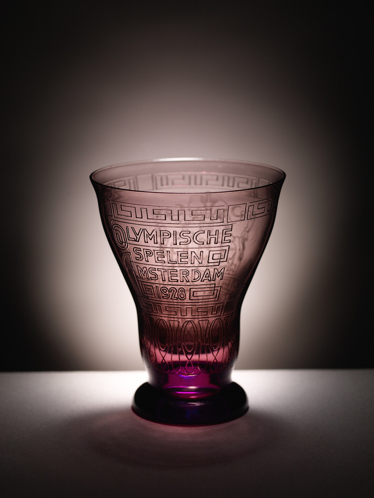 Helder paars glas. Licht gewelfde voet. Convex-conisch, licht ingesnoerd lichaam. Rondom lichaam twee meanderranden, waartussen het opschrift: OLYMPISCHE/ SPELEN/ AMSTERDAM/ 1928/. Op andere zijde het gekroonde stadswapen van Amsterdam gehouden door twee leeuwen, waaronder een ornamentband. Sporen van verguldsel in opschrift, wapens en ornamenten. Op onderzijde voet het etsstempel Cuypers-Kannegieter.