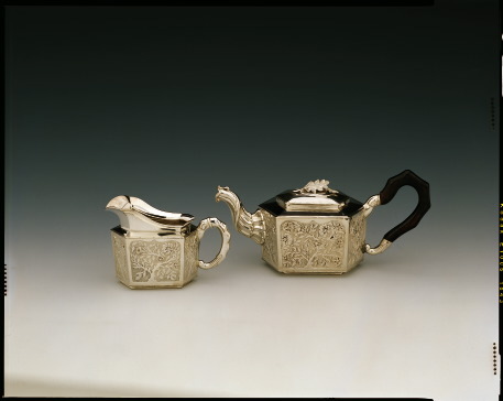 Dit servies werd geleverd aan 'Jonkvrouwe A.G. van der Voort' en is thans in particulier bezit (Christie's 1999, p. 75 nr. 388). Op 4 en 26 juli 1841 volgde nog een groot theeservies: '1 zeskante gedreven chineesche theepot gk 550 F. 90,- [en] 1 zeskant gedreven melkkan gk 355 F. 80,-' (vriendelijke mededeling van de heer B.J. van Benthem). Ook andere zilversmeden maakten theeserviezen met exotische versieringen. In 1858 maakte Johann Georg Meijer een driedelig servies met een theedrinkende oosterling als dekselknop (cat.nr. KB 1322). ( Bert Vreeken)