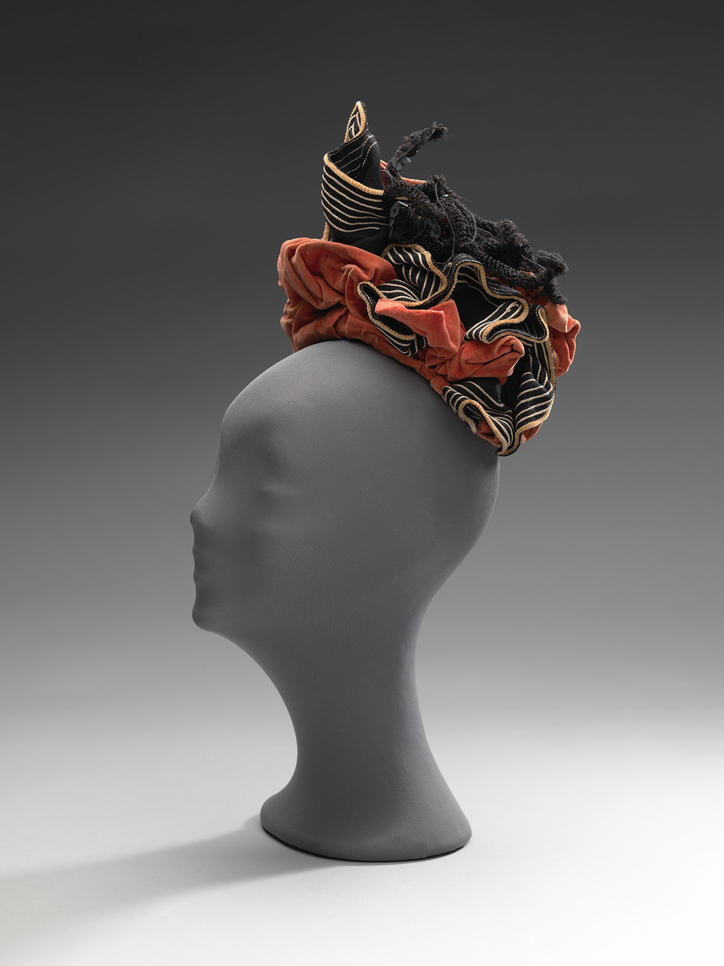 Kapje van hoedengaas bedekt met gedrapeerd tomatenrood fluweel. Aan een zijde versierd met een in elkaar gerimpeld zwart vilten band. Geglansde zwarte voeringkatoen.