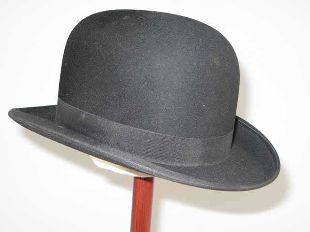 Zwarte bolhoed van vilt. Rand is afgezet met zwart ripslint. Langs de bol een ripslint van 2.5 cm. Bewaard in ovale kartonnen doos.- Trefwoorden