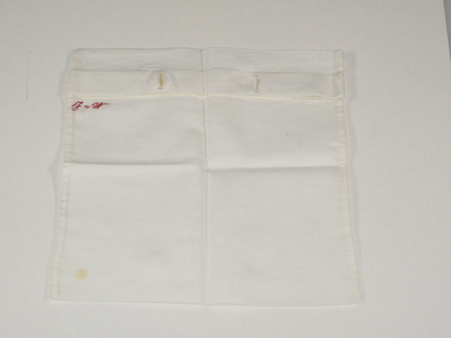 Wit katoen, overslag met sluiting d.m.v. twee knopen, waarvan er één ontbreekt- Trefwoorden