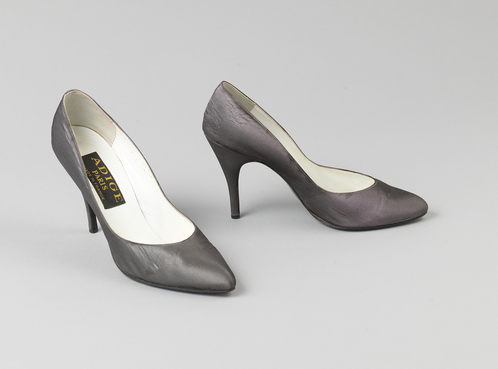 Avondpumps met zeer hoge hak, grijze tafzijde. Behorend bij tafzijden avondjapon (KA 18649).- Trefwoorden