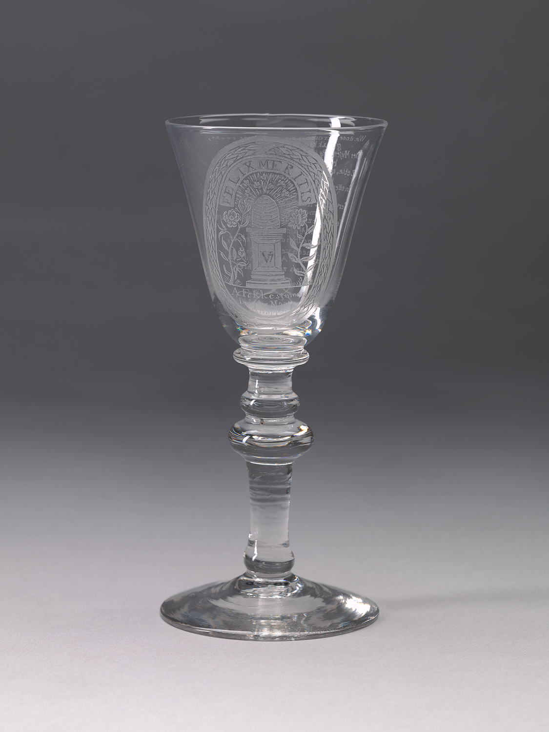 Helder kleurloos glas. Licht conische voet. Basisknoop. Balusterstam met knoop en schijf. Conische kelk met afgeronde basis. Op kelk een met bladranken omkranst medaillon waarin een bijenkorf met bijen op een voetstuk, het embleem van het genootschap Felix Meritis. Aan weerszijden een roos en een zonnebloem. Op voorzijde voetstuk: V7/. Boven voorstelling het opschrift: FELIX MERITIS/ (Gelukkig door Verdiensten). Onder voorstelling: A. Fokke simonsz/ Lidt der Maat,,/ schappy./ Op andere zijde kelk: Wie door verdiensten zig, met recht,/ gelukkig ziet,/ Der Musen, Pallas en Mercuur, zyn/ hulde biedt;/ Zette, onbezorgd, den voet op deez'/ doorlugten drempel:/ En offere aan elke kunst hier, in heur/ eigen Tempel:/ Terwyl dit huis weergalmt, van der/ Camoenen toon/ Verheug't zig in de vlyt van 't kroost/ van Maja's Zoon;/ Op dat de godheid, die, weleer,/ Atheen verlichtte,/ In deeze onze Amstelstad een/ vasten zetel stichte!/. Gesigneerd op voetrand: A Hoevenaar/.