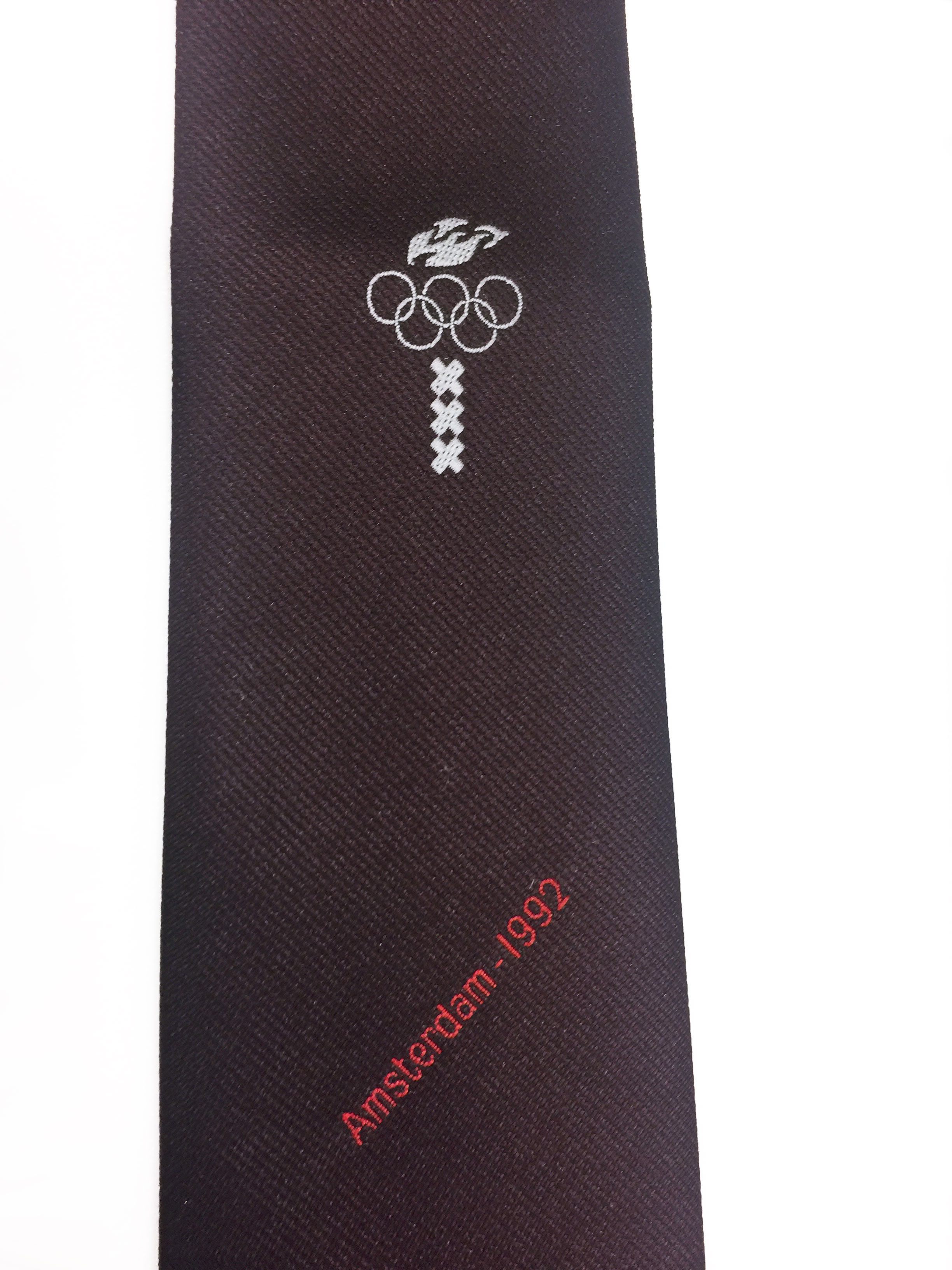 Bordeaux kleurige stropdas. Ingeweven in wit het beeldmerk van de Olympische Spelen 1992: Olympische cirkels met daaronder de drie kruisen van de stad Amsterdam ; daarboven een vlam. Diagonaal ingeweven in rood: Amsterdam 1992.