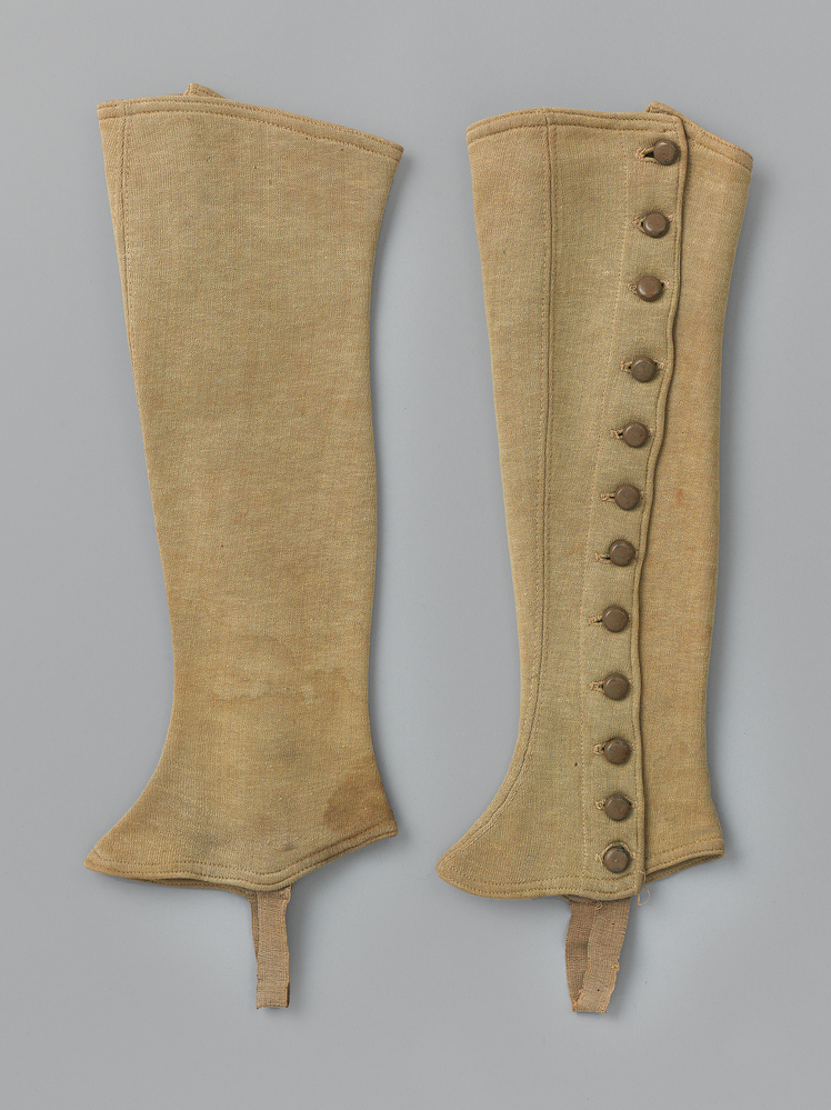 Paar camelkleurige meisjes slobkousen van tricot met geruwde achterkant. De kous sluit door middel van twaalf kleine sierknoopjes langs de binnenzijde van het been. Onder de voet een elastieken band om de kous op zijn plaats te houden. De kous is in vorm geknipt. Hierdoor ontstaat middenachter en middenvoor een naad welke met de machine op de goede kant aan weerszijden overgestikt is.