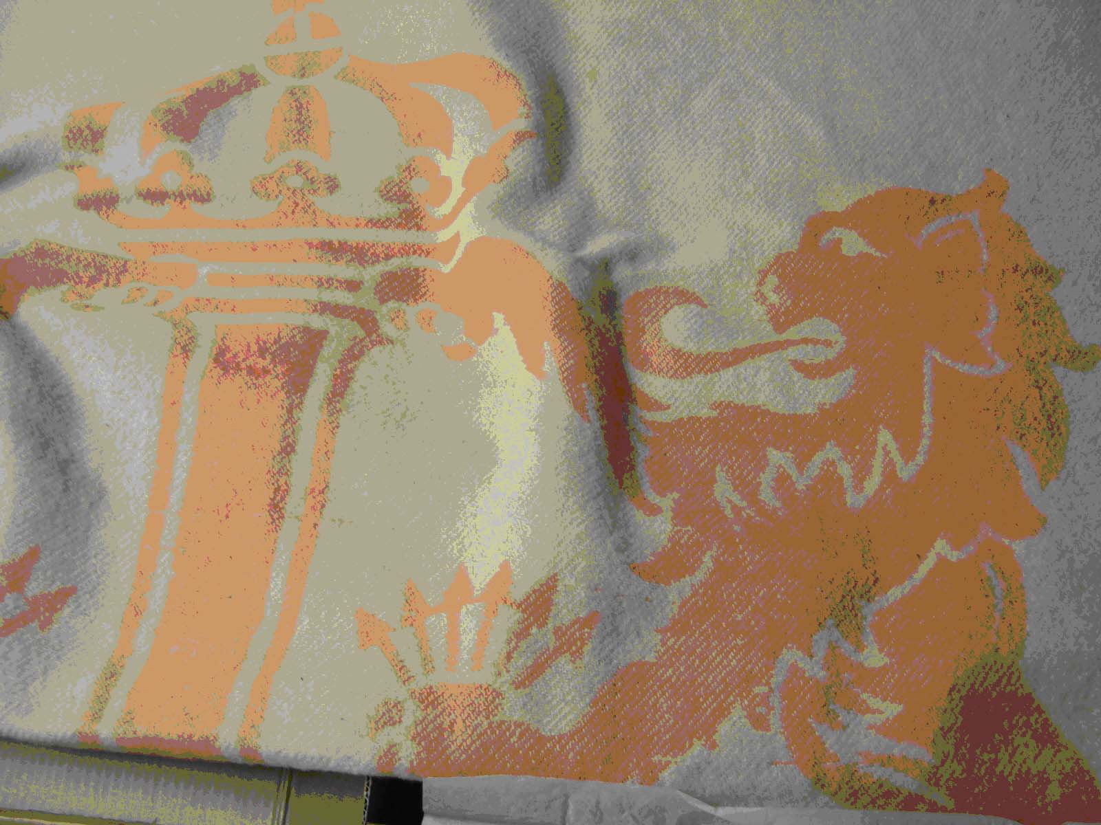 Wollen deken, dubbel weefsel in naturel/zalmrose. In middengedeelte een gestikeerde letter J, eindigend in een kroon. Aan weerzijden leeuwen met bundel van zes pijlen. Langs onderrand een golvende streng oranjebloesem.- Trefwoorden