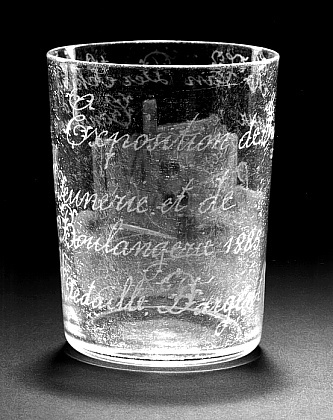 Helder kleurloos glas. Vlakke bodem. Cilindrisch lichaam. Op lichaam een interieur met bakkersoven. Hierboven in radgravure het opschrift: A Van Der Schuyt/ Ingenieur/ Constructeur/. Op andere zijde: Exposition de/ Meunerie et de/ Boulangerie 1885/ Medaille, D' argent/.
