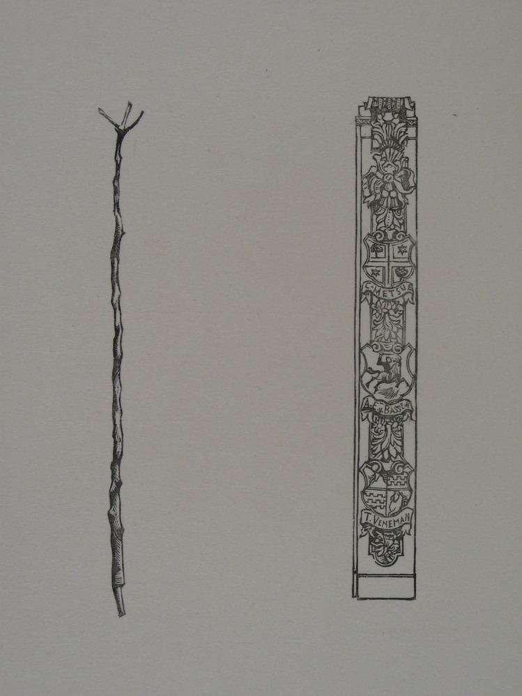 - Houtsnede met links de Justitie roede en rechts de deurlijst met namen, 1934 - 1935