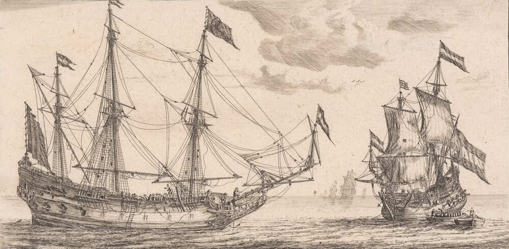 - "De vergulde dolphijn een straets-vaerder, de kat een Frans-vaerder," (nr.2 van het eerste deel uit de serie: différents vaisseaux d'Amsterdam), 1650 - 1675
