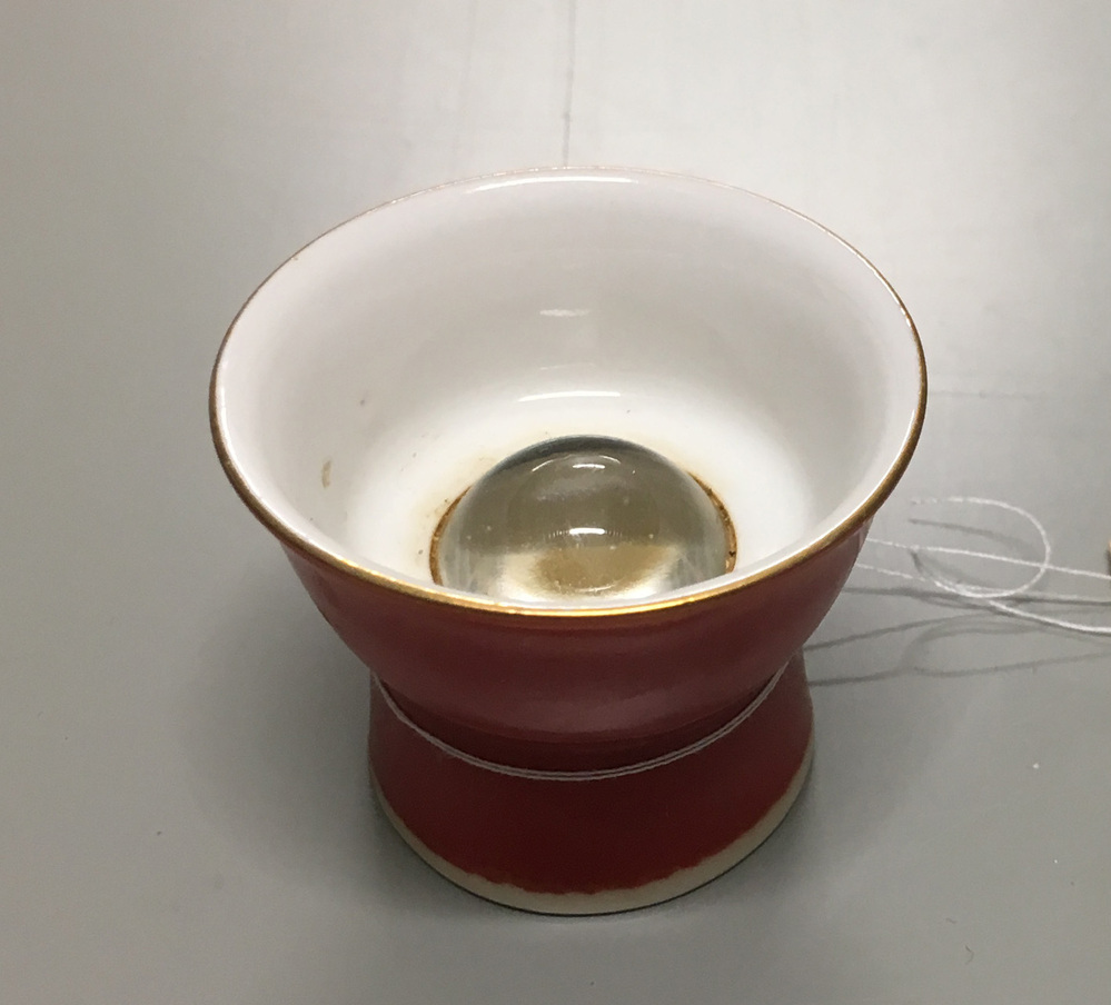 porseleinen borrelglaasje met op de bodem een halve bol van kleurloos glas- Trefwoorden