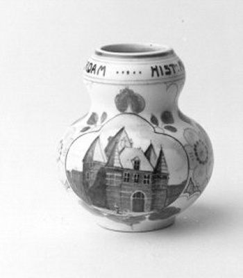 kalebasvormig vaasje met aan één zijde een cartouche met daarin 'De Waag van Amsterdam'- Trefwoorden