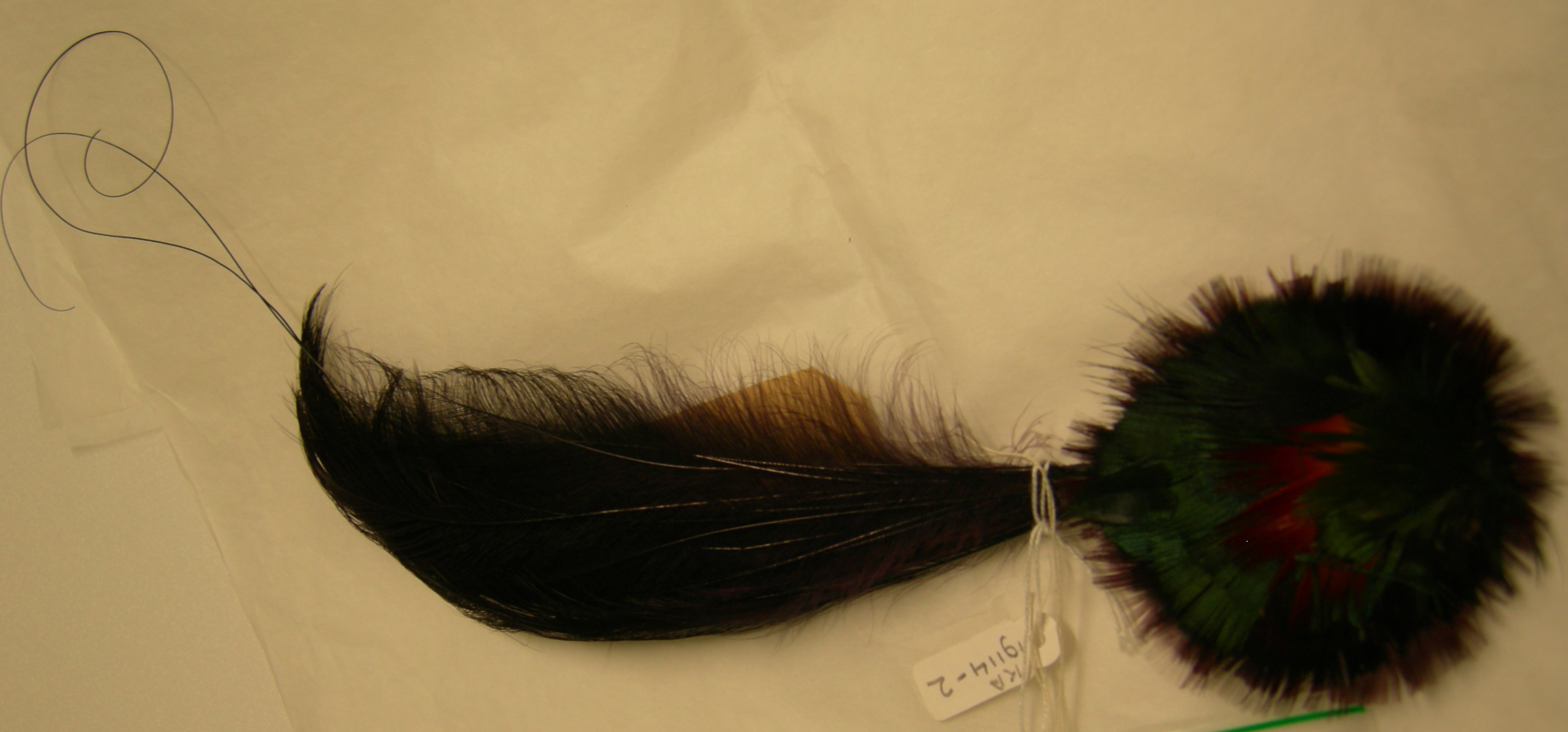 gekleurde kokarde van reiger en fazant met een pluim van in auberginekleur geverfde reigerveren