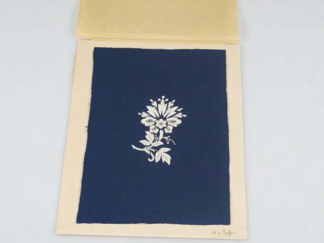 lapje van donkerblauw, in het middenvlak een gestilleerde bloem, uitgevoerd in wit katoendraad.- Trefwoorden
