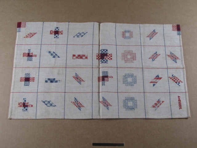 Natuurkleurige ondergrond, ondeverdeeld in 36 vierkanten. In elk vierkant een andere techniek van stoppen, uitgevoerd in blauw, rood en wit katoengaren.