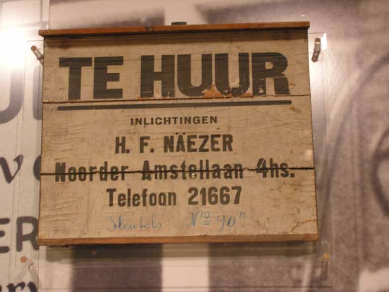 - opschrift: TE HUUR/inlichtingen H.F. NA EZER/NOORDER Amstellaan 4 hs./TELEFOON 21667/Sleutels No 90 h/.: in zwart