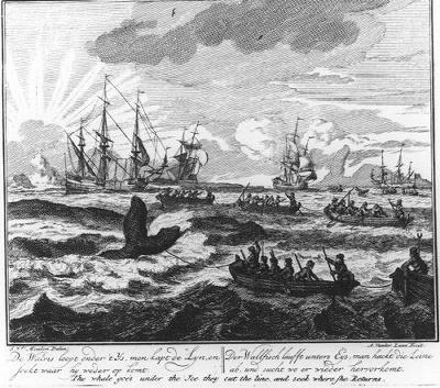 - "De walvis loopt onder 't ijs, men kapt de lijn, en soekt waar hij weder op komt." (nr. 4 uit de serie walvisvaart)