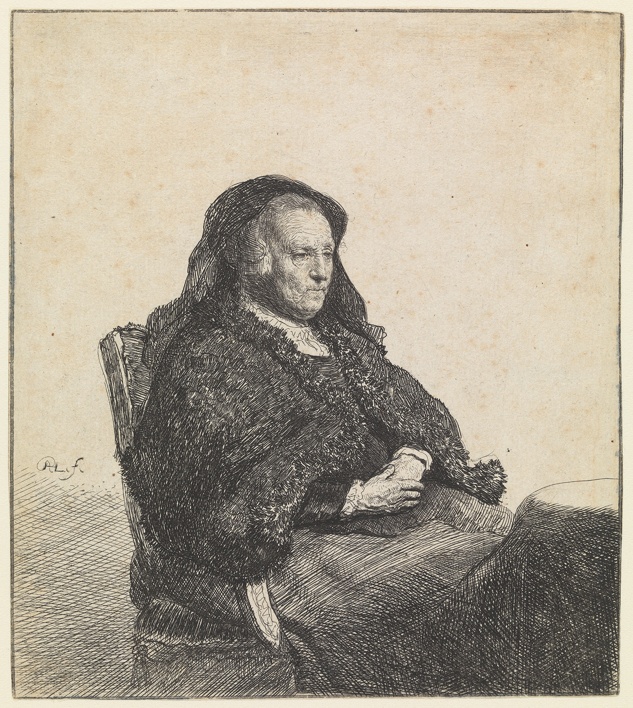 - Rembrandt's moeder aan tafel: driekwart lengte, naar rechts, 1631
