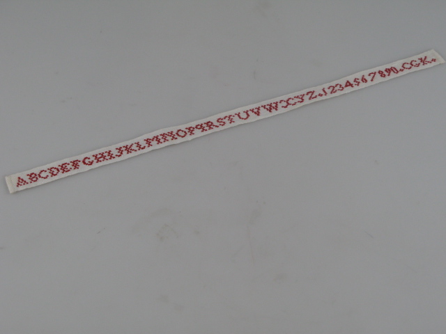Dit kleine strookje stof is niet breder of langer dan één alfabet en een cijferreeks. Mogelijk werd het als houvast gebruikt bij het samenstellen van een merk- of letterlap. Een geheugensteuntje. Er is één ander alfabetlint in de collectie, gemaakt door Grietje Tap (KA 19718). De meisjes wonen in hetzelfde weeshuis, maar verschillen ruim tien jaar in leeftijd. Mogelijk gaat het dan om een gangbaar hulpmiddel al zou een alfabet op papier ook volstaan kunnen hebben. Is er sprake van twee vliegen in één klap? Het is uitzonderlijk dat deze kleine werkjes bewaard zijn gebleven. Veel proeflapjes zijn verloren gegaan omdat ze van minder betekenis zijn dan het serieuzere werk in de vorm van merk- stop- en letterlappen. Neeltjes lint meet 36 x 1,5 cm. Ze heeft rood katoenen borduurgaren op een katoenen band gebruikt. Op grond van haar leeftijd, heeft ze dit lintje mogelijk in 1900 gemaakt. Ze sluit het af met haar initialen CGK.