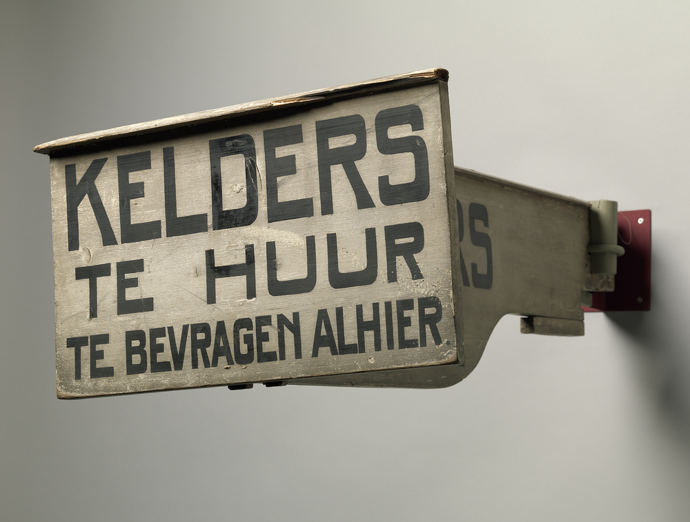 opschrift op beide zijden/op haaks uitstekend bord: KELDERS/TE HUUR