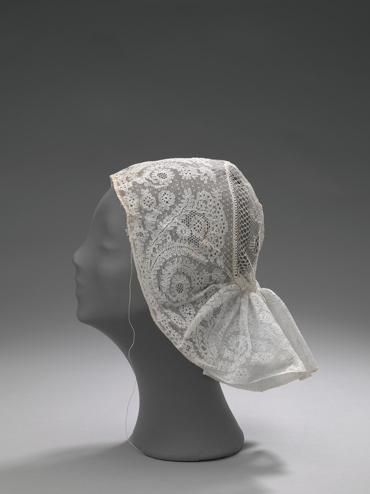 Witte muts van ingeweven stippen tule, met machinale kanten rand. Beroepskleding, geen mode. Onduidelijk te dateren, moet nader onderzocht.