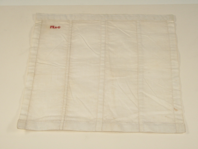met de hand gezoomd; linksboven met rood garen in kruissteek M.d.G.- Trefwoorden