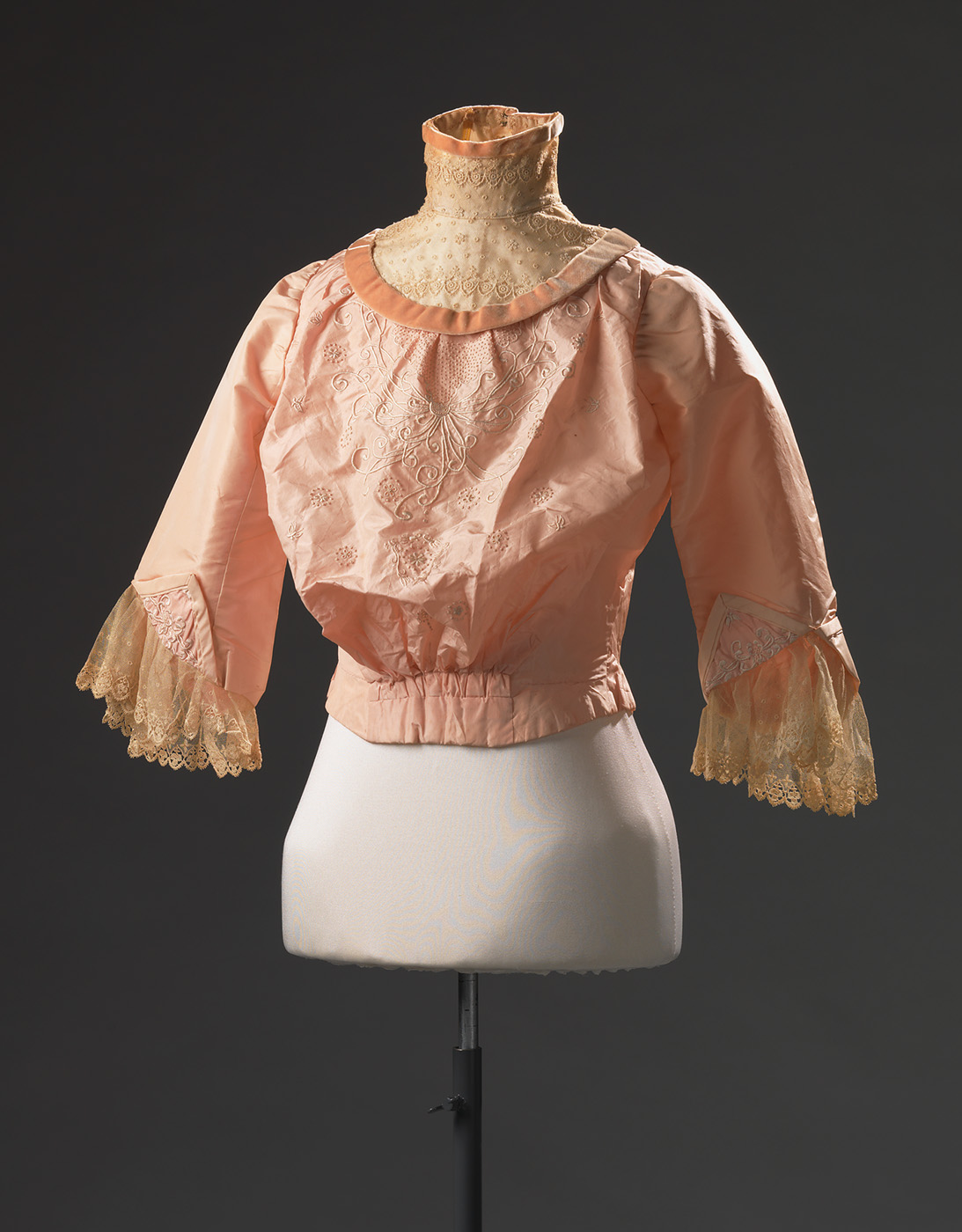 Roze lijfje van een japon. Het lijfje heeft een hoge boord, met fluweel en tule, driekwart mouwen en een wijdbloezende voorkant. Op de wijdbloezende voorkant is handgeborduurd borduursel te zien. Langs de manchetten is machinale tule bevestigd. De sluiting is op de schouder. Middenachter bevindt zich een oog, waar de rok aan bevestigd werd. Dit betekent dat de rok over het lijfje werd gedragen. In de tailleband is in goud de naam van de vervaardigers gedrukt.