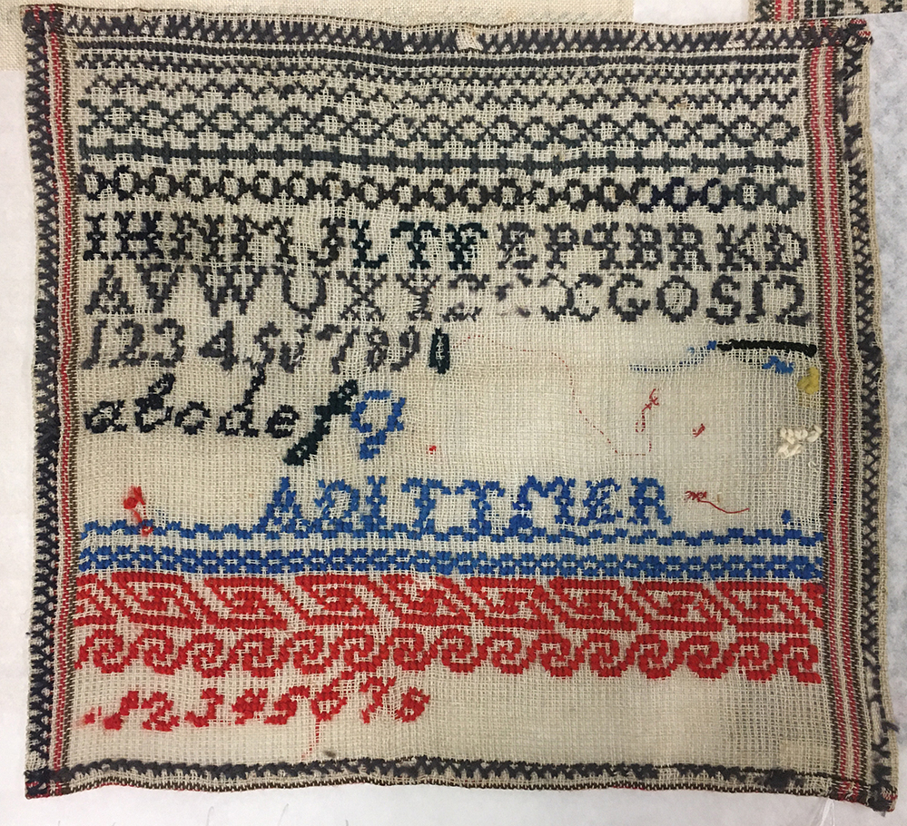 : Het eerste alfabet op deze doek is opgebouwd naar moeilijkheidsgraad. Eerst leerden de meisjes de stokletters borduren de I H N M J L T F E P B R K en D, als ze dat onder de knie hadden kwam de volgende uitdaging, de zogenaamde schuine letters A V W X Y en Z en ten slotte de ronde U C G O Q en S. Practice makes progress. Daarna volgde vaak het ABC in gebruikelijke volgorde.