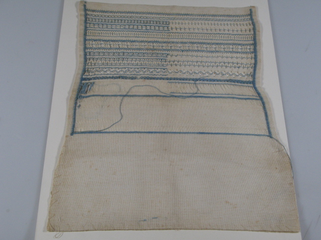 Mevrouw Van Soest heeft met 21 doeken uit één en dezelfde familie aanzienlijk aan de collectie merk- en stoplappen bijgedragen. De schenking omvat het werk van drie generaties: overgrootmoeder Alida Reekers, grootmoeder Wilhelmina Westerveld en de kleindochters Anna, Metta Margaretha en Emma Dittmer en hun nichtje Dorothea Dittmer. Werk van de oudste kleindochter, Wilhelmina, ontbreekt evenals borduurwerk van de moeder van de meisjes. Mevrouw Van Soest is een dochter van Metta Margaretha en Evert van Soest. De meeste van de doeken bevatten de naam of de initialen van de borduursters. Deze naden- en stekenlap niet. Mogelijk heeft dat met het soort handwerk te maken. Gezien de samenstelling van de schenking en de leeftijd van dit werkje, begin twintigste eeuw, kan het bijna niet anders of dit lapje is tot stand gekomen onder de handen van één van de meisjes Dittmer uit de laatste van de drie generaties. De meisjes leerden op dit soort doekjes diverse openzoomtechnieken en open naden gebruiken. De jonge handwerkster deed dit met lichtblauwe borduurkatoen op een katoenen stramien. Het formaat van de doek, 35,5 bij 26 cm, was hoogstwaarschijnlijk wat te veel van het goede. Het meisje Dittmer haalde de eindstreep niet, de doek bleef onvoltooid.
