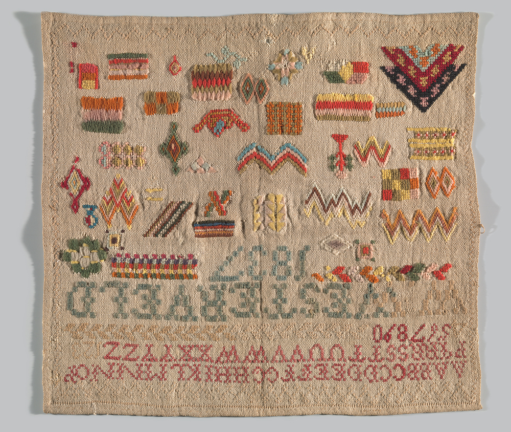 opschrift onder naam borduurster: 1837: jaar voltooiing doek