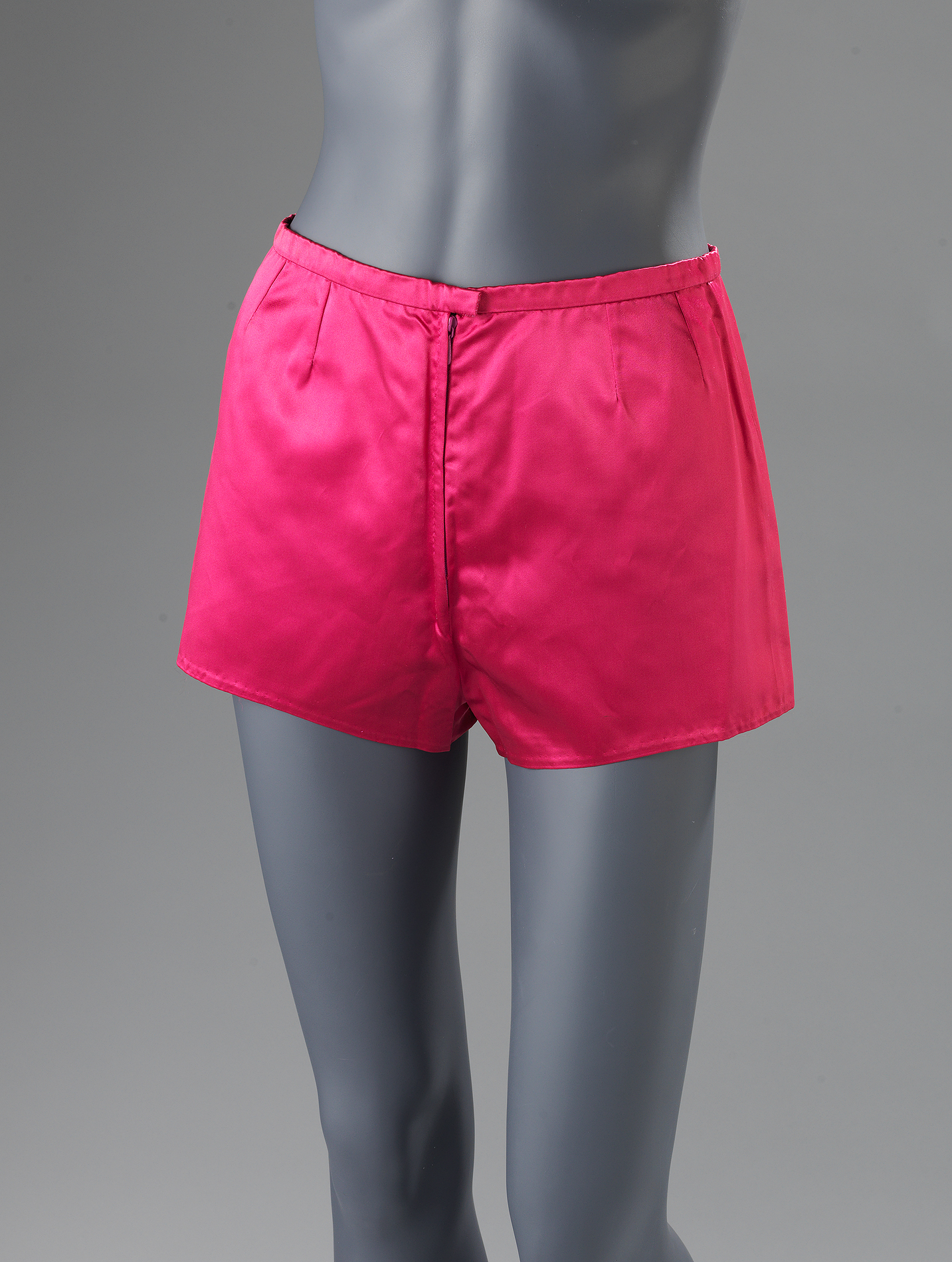 Cerise satijn. Opgesneden pijpen. Sluiting middenvoor d.m.v. een ritsluiting van 18 cm. Smalle tailleband.