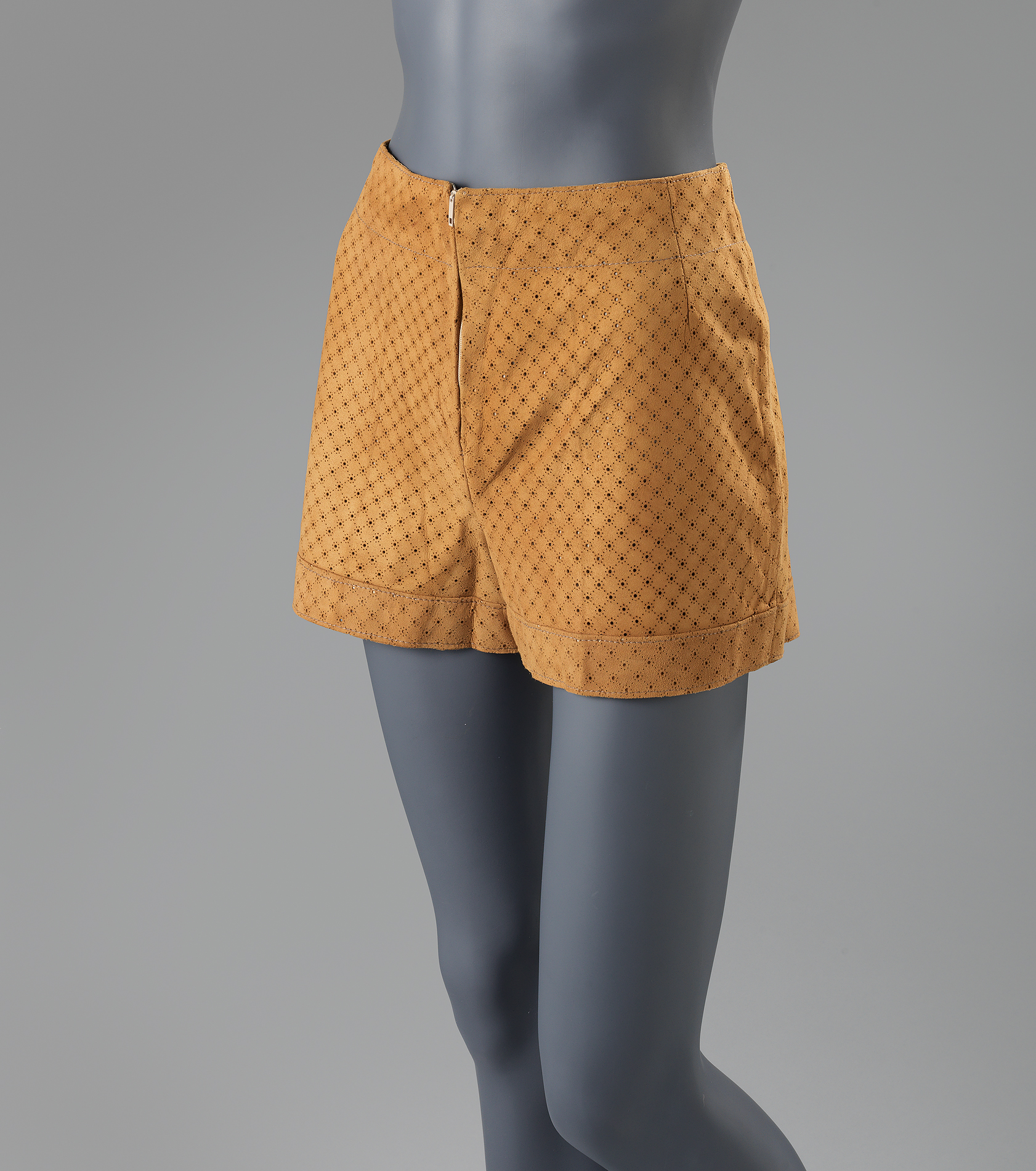Bruin opengewerkt suède. Regelmatig patroon van uitgeponste grote en kleine gaatjes maakt dat het suède heel soepel aanvoelt. Sierstiksel langs taille en omslag pijpen. Sluiting middenvoor d.m.v. een ritssluiting van 18cm. en een strookje klitteband. Voering van beige voeringzijde.
