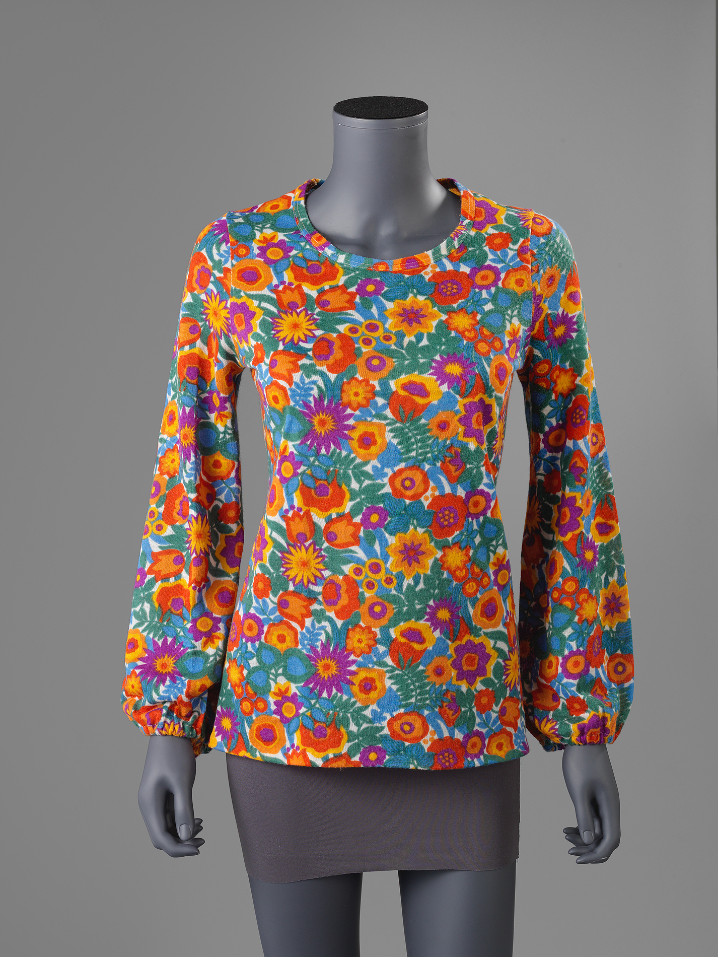 Longsleeve truitje van tricot bedrukt met een bloem-en bladmotief in paars, oranje, blauw, geel en groen. Ronde hals. Lange wijde mouwen met onderaan elastiek.