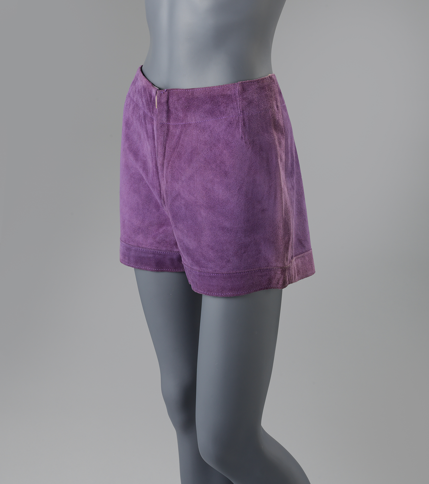 Paars suède. Sierstiksels langs taille en omslag pijpen. Sluiting middenvoor d.m.v. een ritssluiting van 18 cm. en een strookje klittenband. Voering van grijze voeringzijde.- Trefwoorden
