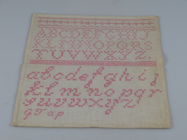 Naast haar rodeschoollapje en een letterlap met een IHN-alfabet, maakt Grietje nóg een derde, ongedateerde, letterlap. Dit kleine doekje is gevuld met sierranden en twee alfabetten. Gescheiden door een Griekse meander is dat aan de bovenzijde een alfabet in kapitalen en aan de onderzijde een alfabet in kleine letters in cursief. Op de onderste regel laat ze haar naam achter: G.Tap. Drie letterlappen en één alfabetlint, had Grietje moeite met het leren van het alfabet? Hoewel de doek niet gedateerd is lijkt het de laatste van de drie te zijn. Het IHN-alfabet, dat opgebouwd is naar moeilijkheidsgraad -eerst de stokletters, dan de zogenaamde schuine en tot slot de ronde letters- ontbreekt en het tweede alfabet is uitgewerkt in stersteek. Deze steek heeft een hogere moeilijkheidsgraad en vraagt meer inspanning van de jonge meisjes. Grietje ploetert voort, maar ze maakt wel vorderingen!