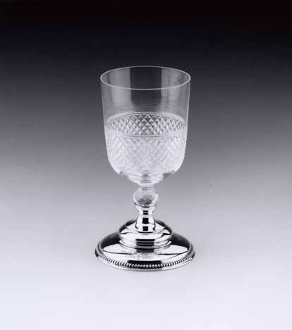 Kelkglas met met meervoudig gewelfde zilveren voet met parelrand. Op voet is gegraveerd: AAN O. HANSEN/ 1870 15-9 1895/ en: VAN MEDEBESTUURDEREN V.D. KOSTHUIZEN/ DER MY V D WERKENDE STAND/. Stam van kleurloos glas met gefacetteerde nodus. Cilindrische kelk met afgeronde basis. Onderste helft kelk in diamanten geslepen.