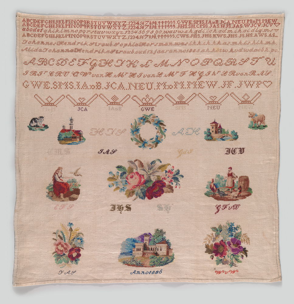 opschrift onder derde rij motieven: IAS / Anno 1886 / WvW: JAS: Johannas Abraham of Johannes Adam, broers van borduurster