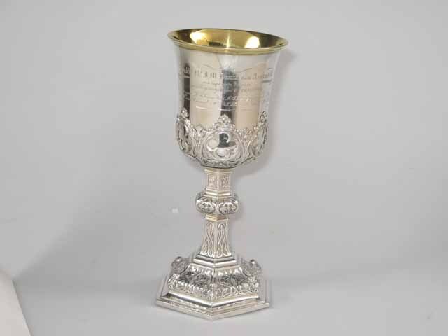 Zilveren beker in gotische stijl. Zeshoekige voet, overgaand in dito stam met knoop. Voet, stam en knoop versierd met glad traceerwerk van blad- en druivenranken en andere motieven, tegen een geruwde achtergrond. Klokvormige, goeddeels gladde kelk met uitbuigende mondrand, de onderste helft versierd met opgelegd traceerwerk van vierpassen. De mondrand, evenals de binnenzijde kelk, verguld.